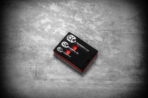The Boxo BX356-R2 3-Piece Stubby Ratchet Set offers a compact and durable solution for precision fastening in confined spaces. Each ratchet features a 72-tooth mechanism, delivering a 5° arc swing for optimal control. Crafted from high-quality chrome vanadium steel, the set includes 1/4", 3/8", and 1/2" drive sizes, each with a quick-release button for easy socket changes. The high-polish chrome finish ensures corrosion resistance, while the ergonomic comfort-grip handles provide enhanced user comfort. Housed in a dual-colour laser-cut EVA foam insert, this set offers organized storage and easy access.