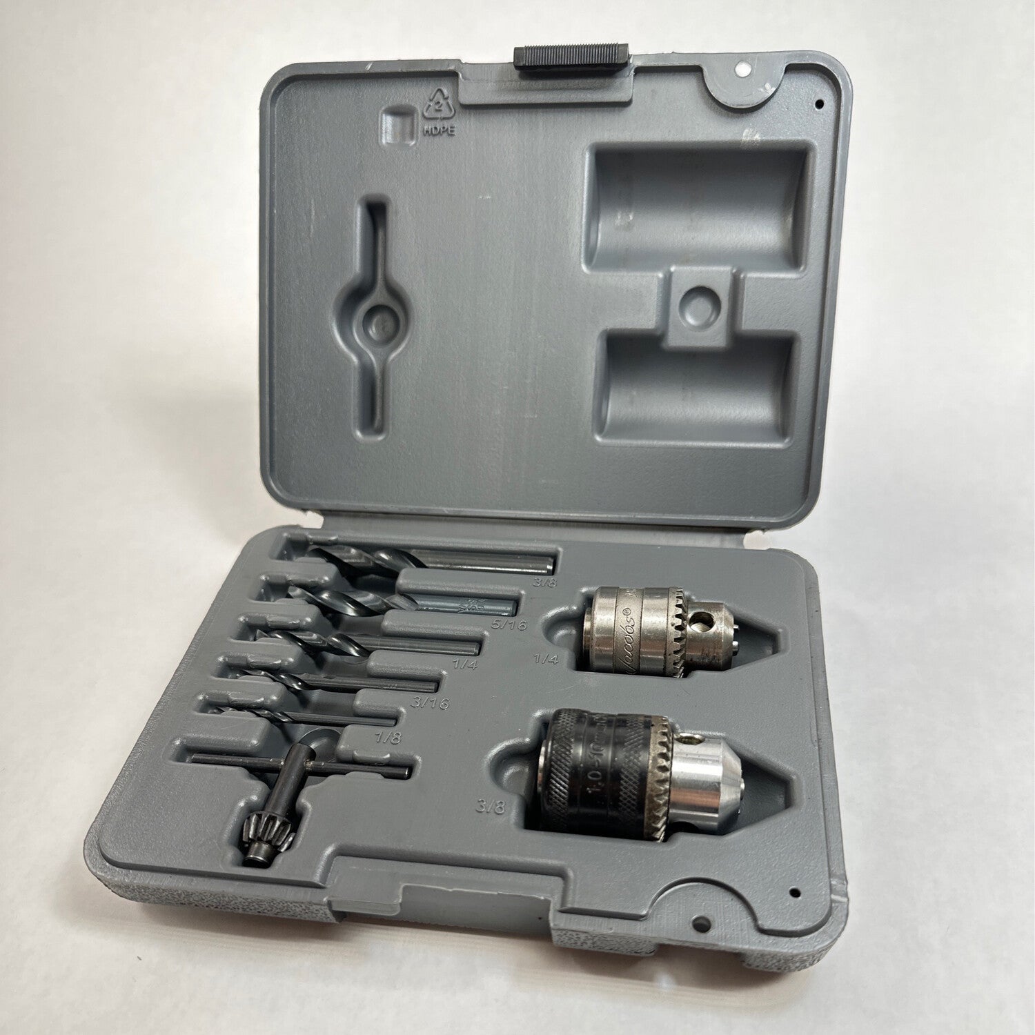 • Includes 1/4" and 3/8" drill chucks, a chuck key and (5) stubby drill bits in 1/8, 3/16, 1/4, 5/16 and 3/8" sizes