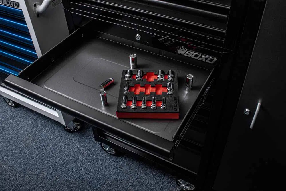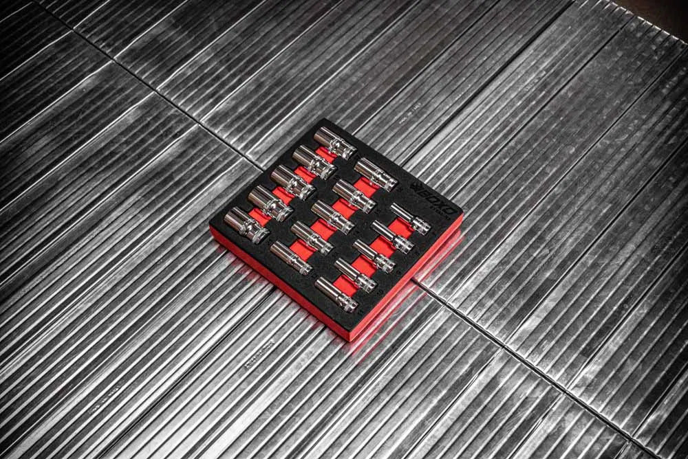 The BOXO 15Pc 3/8" Semi Deep Socket Set offers the perfect balance between shallow and deep sockets, providing enhanced reach without compromising strength. Manufactured to professional standards, each socket ensures a secure fit and reliable torque transfer. Housed in durable EVA foam for organised storage and easy identification, this set is ideal for both automotive and workshop use.