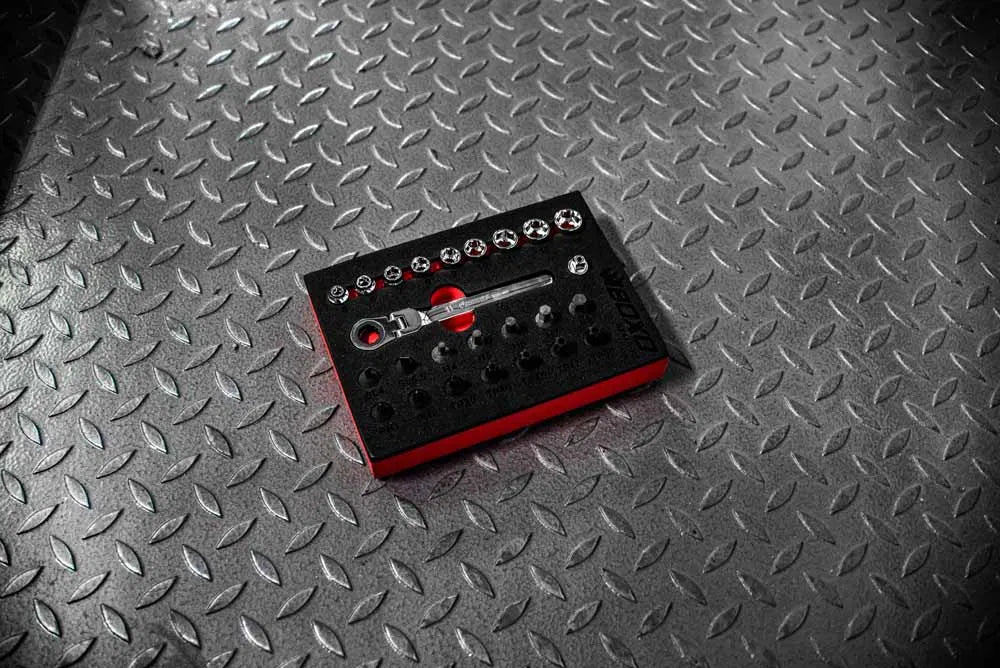 The BOXO 25Pc 1/4" Drive Low Profile Socket & Stubby Bit Socket Set is designed for precision work in tight or hard-to-reach spaces. This compact and versatile set includes low-profile sockets and stubby bit sockets, offering maximum accessibility without compromising strength or performance. Crafted from high-quality materials for durability, and organised in a custom foam tray, it's an essential addition for professionals who demand efficiency and reliability in confined working environments.