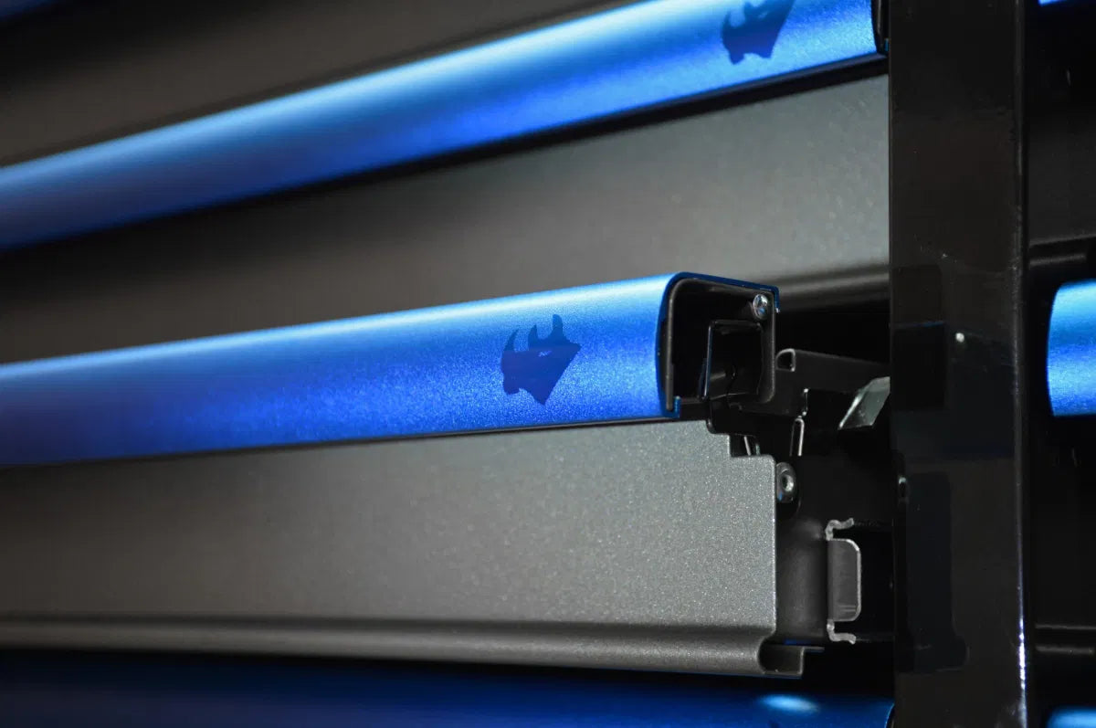 The 3-inch Shallow Drawers are ideal for storing BOXO Tool Control Foams, ensuring your tools are organized. For added security, the Robust Barrel Locking Mechanism with welded lock tabs keeps your contents safe. The toolbox features a Built-to-last Reinforced Double Wall Construction with a double-skin chassis for exceptional durability.