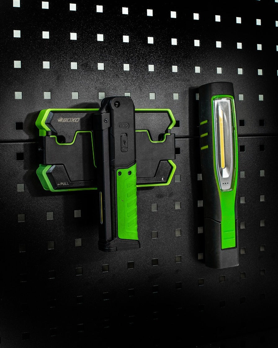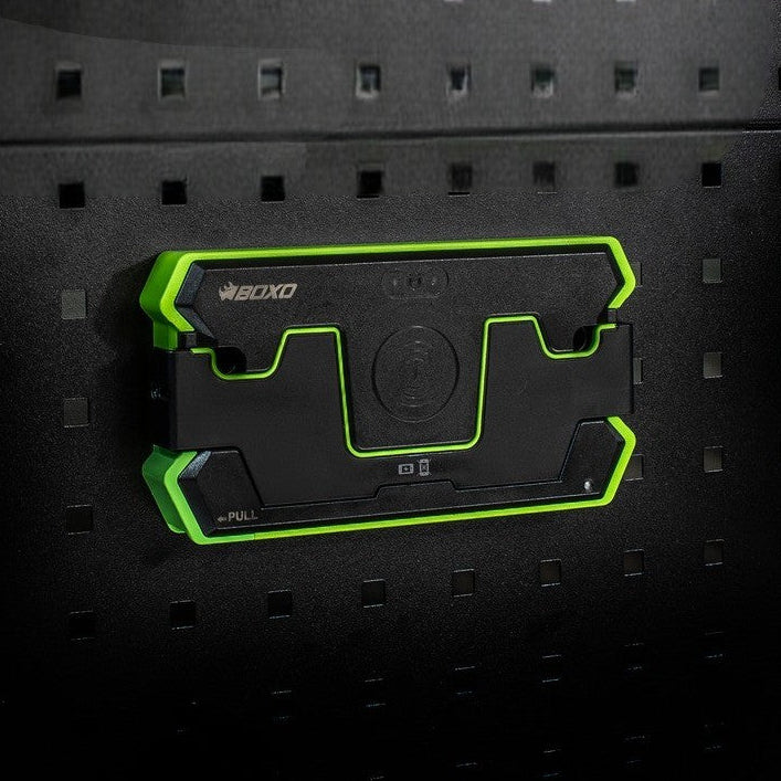 The BOXO 10W Wireless Charging Pad in green is a robust and efficient charging solution designed for professionals. Featuring a durable nylon TPE housing, it offers a 10W power output for fast and reliable charging of Qi-enabled devices. The integrated magnets and built-in screw holes allow for versatile mounting options, ensuring secure placement in various work environments. Additionally, the patented pull-out phone holder provides added convenience for charging smartphones