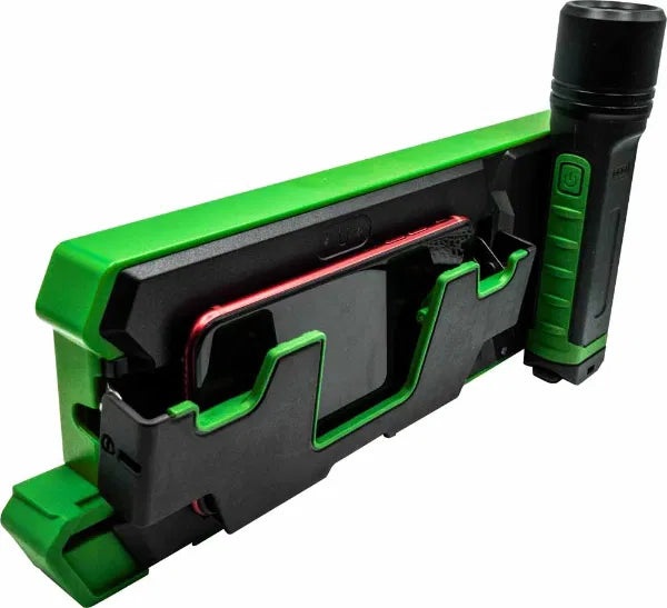 The BOXO Wireless Dual Charging Pad 20W is a high-performance charging solution designed for professionals. It features dual 10W wireless charging pads, allowing simultaneous fast charging of two devices. The pad includes a patented pull-out phone holder and magnets for docking BOXO wireless lighting tools. Constructed with durable nylon TPE housing, it offers robust performance in demanding environments.