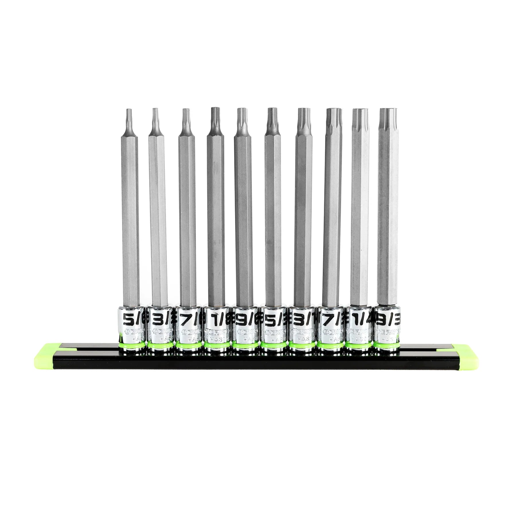 Introducing the GRIPEDGE 10-PC 1/4" Drive Long SAE Hex Driver Set with R.P.T. (Rounding Prevention Technology). Designed to replace standard tools, R.P.T. Technology offers up to 50% more torque on good fasteners and up to 400% more on damaged ones. Precision machined from S2 steel, these hex bit sockets are corrosion-resistant and feature 4” lengths for better access to hard-to-reach areas. The Set includes sizes from 5/64 to 9/32", perfect for most automotive and industrial applications, and comes on a premium aluminium socket rail.