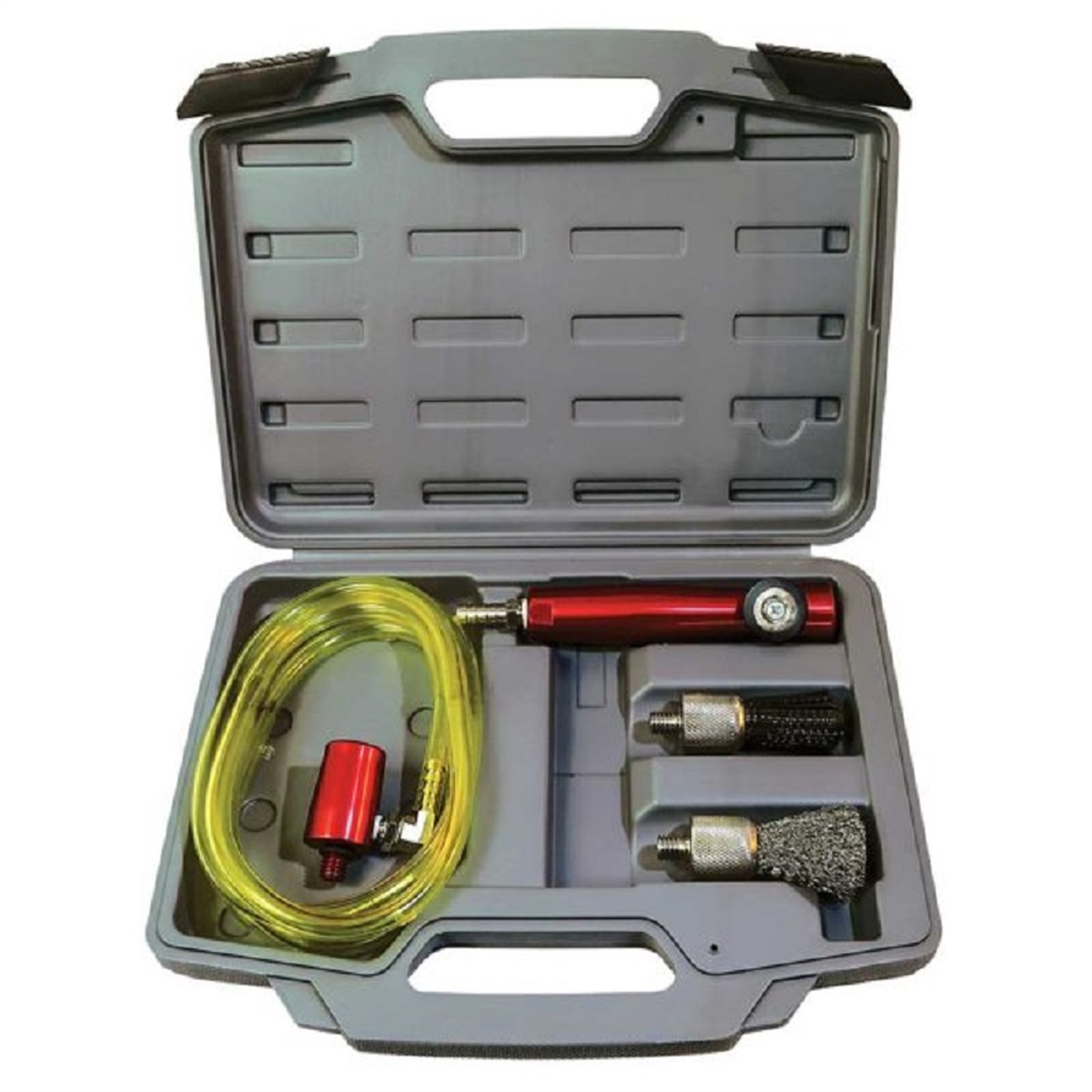 Includes: Aluminium Handle with Flow Valve and Magent, Venturi Assembly, Stainless Steel Flow-Thru Brush, Nylon Flow-Thru Brush, 6′ Chemical-Resistant Hose, 1/4″ NPT x 3/8″ Barbed Fitting, 1/8″ NPT x 1/4″ Barbed Swivel Fitting, #110 Viton O-Ring .375″ ID and Custom, Blow-Moulded Case (#8005-10)