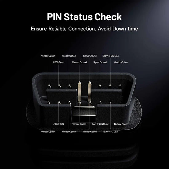 - With integrated PIN status detection, you can quickly identify missing, misaligned, or damaged pins in the OBD interface. This helps ensure stable communication and alerts you to potential hardware faults before beginning diagnosis, saving time and avoiding unnecessary troubleshooting.