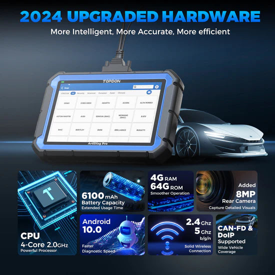 - With its upgraded 4-core 2.0Ghz CPU, 2G RAM and Android 10.0, the ArtiDiag Pro runs faster than ever.