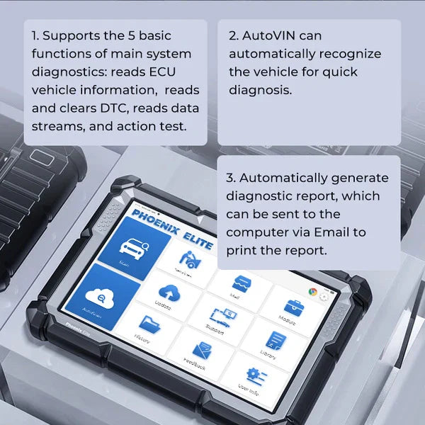 - The Phoenix Elite automatically captures the vehicle’s VIN number and finds all relevant information about the vehicle. Use this feature to save time and prevent mistakes.
