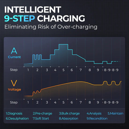 - Its "9-step smart charging" provides strong protection to the battery and the automatic charging and disconnection system eliminates any risk of overcharging.