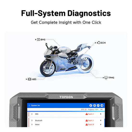 - With comprehensive full-system diagnostics, you can analyse every aspect of the motorcycle. From reading and clearing fault codes to monitoring live data for real-time performance or retrieving ECU information, the versatile functions eliminate the need for multiple tools, ensuring efficient and effective repairs.
